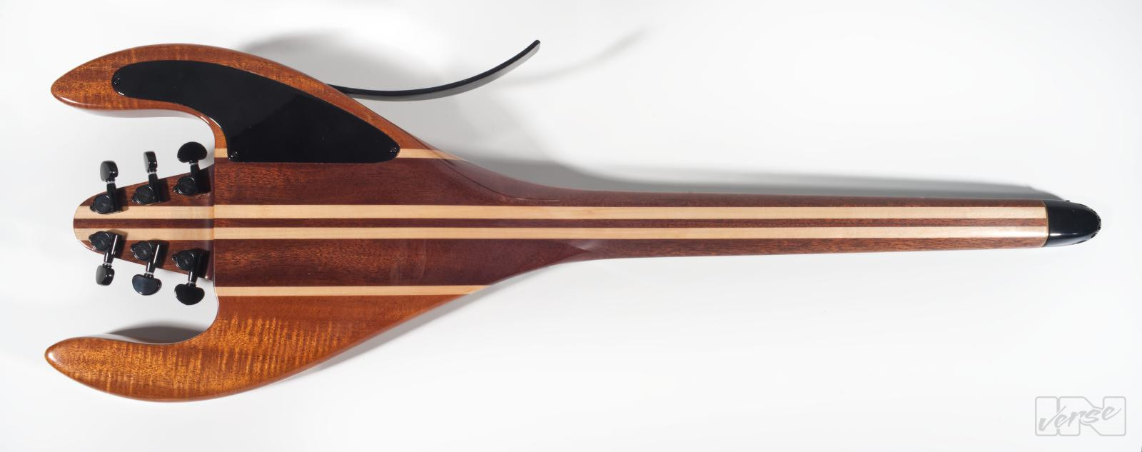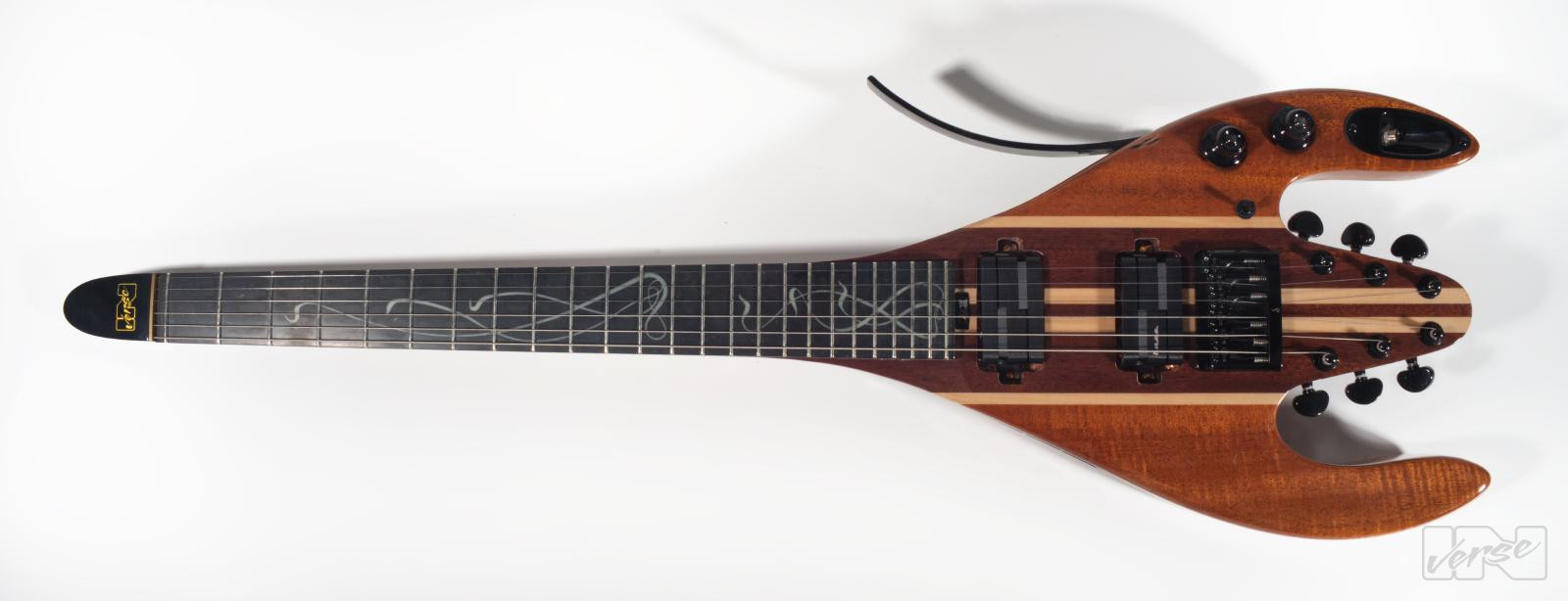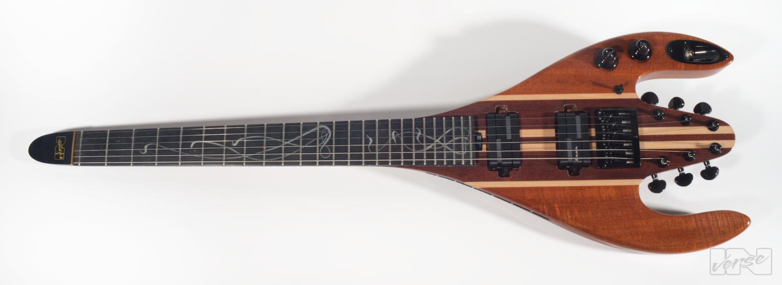 Take off into new orbits with the Fli-guitar, ultra-lightweight at 2.5 kg. Artfully crafted fingerboard inlays that glow in the dark, the folding bail that enables a comfortable sitting position, the beautiful composition of three different woods, the neck thru construction equipped with two carbon fibre truss rods and two alumitone pickups fire this tool up.