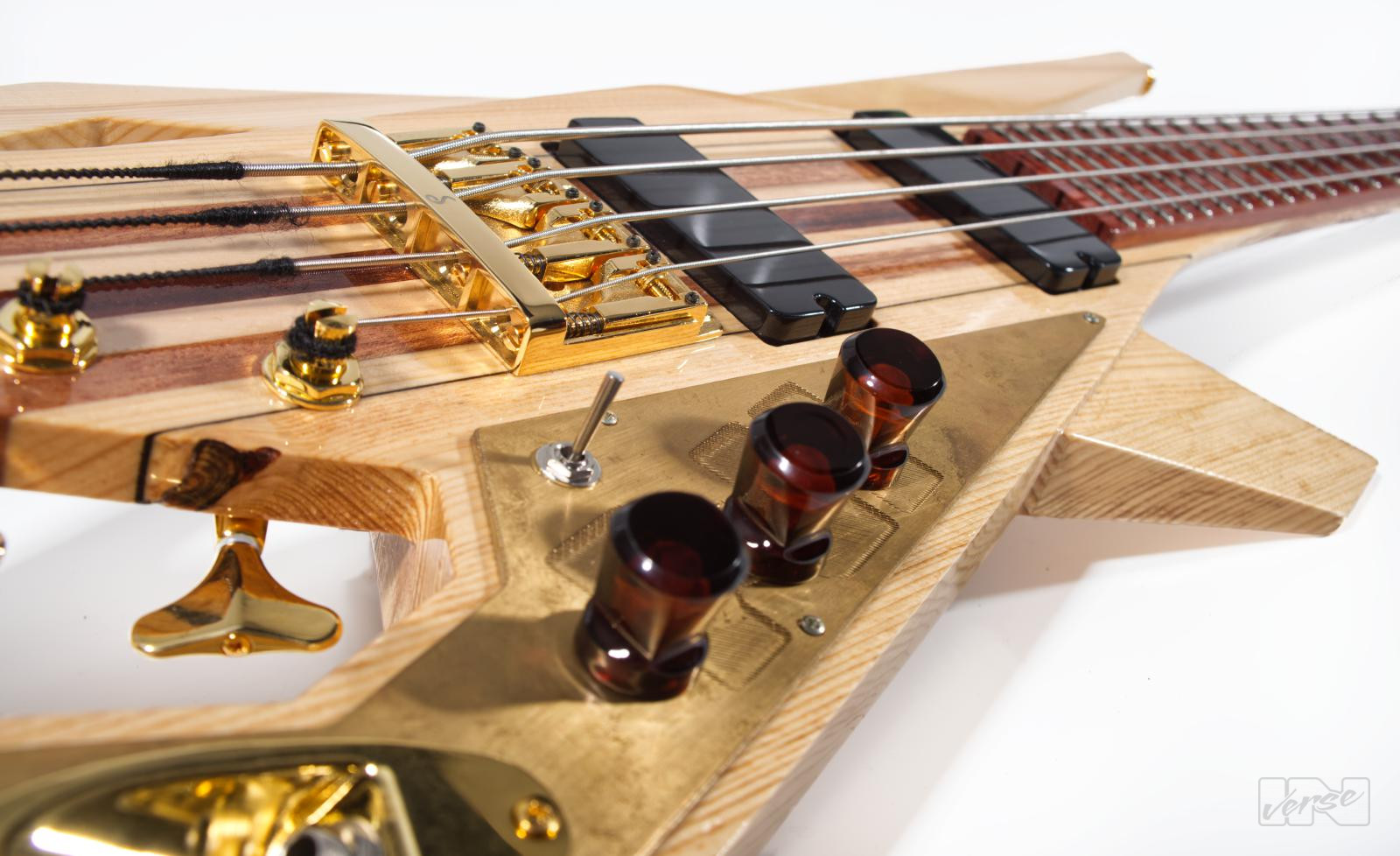 Aggressive looking 3.2 kg light, medium scale Piranha-bass. Responsive 24 frets on a Jatoba fingerboard, discreet high-gloss natural wood finish, carved brass electronicslid and two handmade, passive woodoo soapbars characterise this instrument.