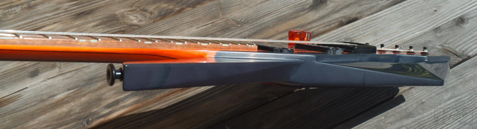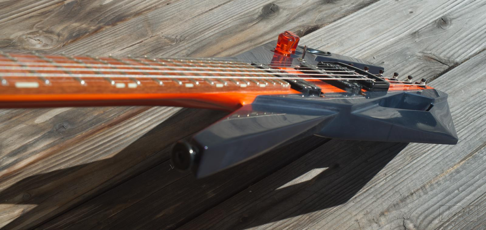 Aggressive looking, 2.4kg lightweight Piranha-guitar equipped with 2 classic humbuckers for versatile sounds. 24 frets on a Jatoba fingerboard, matt, multi-laminated, carbon fibre reinforced neck with unique, rounded trapezoid profile, subtle transparent orange/candyblack matt finish give the Piranha its unique appearance.